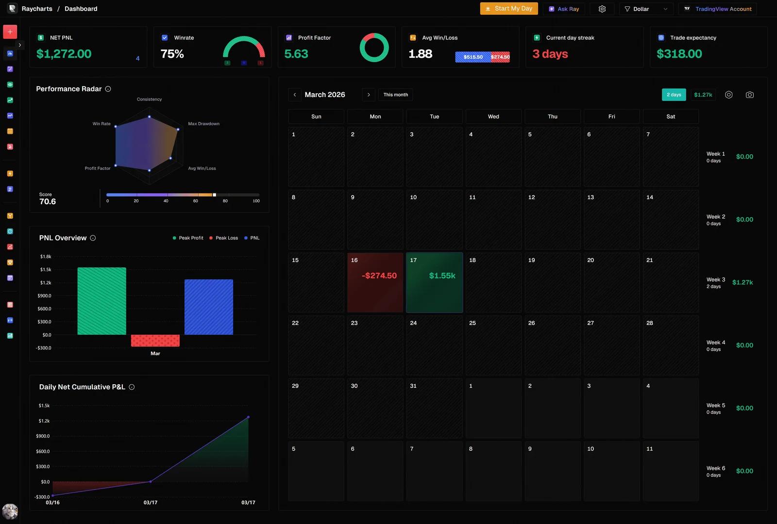 Raycharts AI-powered trading journal dashboard with performance analytics and broker sync